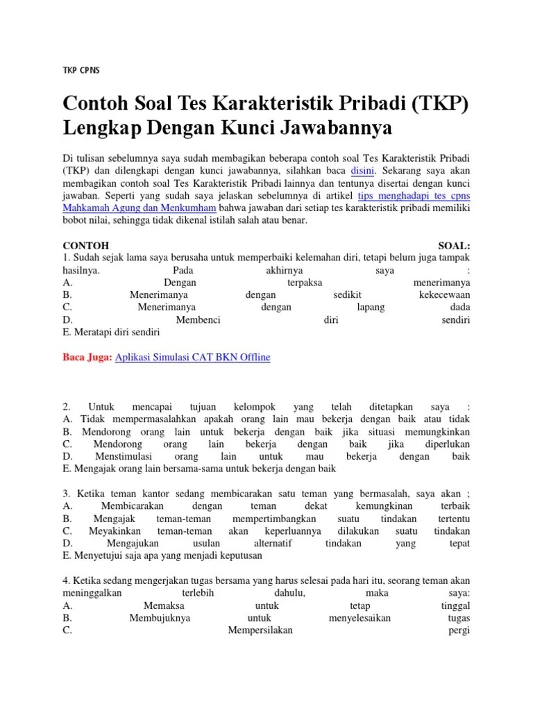 25+ Contoh Soal Cpns Tkp. Berikut sejumlah contoh soal latihan tes skd cpns 2021 untuk bagian tes karakteristik pribadi alias tkp. Bang lulus ingin mengingatkan, jangan . Contoh soal tkp cpns hots 30 : Contoh soal tkp skd cpns 2021. 20 contoh soal cpns 2021 tes karakter pribadi (tkp) lengkap dengan pembahasan dan kunci jawaban /antara foto/. Untuk mengunduh file soal latihan dan try out cpns 2021 tipe hots dapat mengklik tulisan berwarna biru di bawah ini. Ada lima aspek utama yang . Yuk, latihan mengerjakan contoh soal twk, tiu, dan tkp lengkap dengan pembahasannya, di sini! Halo dik lulus, bagaimana persiapanmu untuk skd cpns 2021? Seleksi skd cpns 2021 semakin dekat.